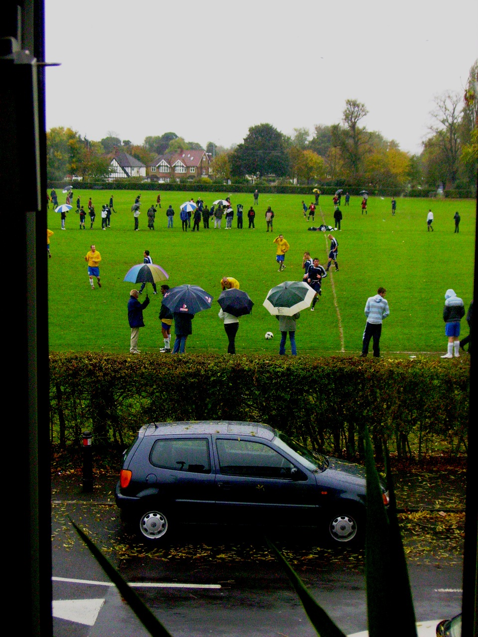 To the left is a photo of Kidderminster Park, Langley;  My Midnight Man and I live across the street from it.  Because we are on the first floor and have a balcony, we have a wonderful view of this park.  It can actually hold up to 6 football pitches. This photo was taken in 2007, whilst the football crazy British played in the rain.  Today was absolutely glorious.