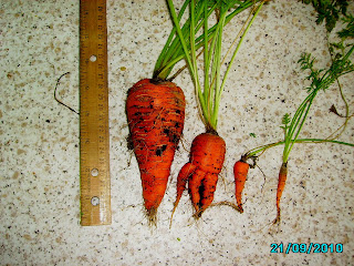 Today I pulled the last of my carrots.  Now the only thing still growing is the yellow squash plant.  The size of one of the carrots was a surprise to me–large actually.  And they went from the ridiculous to the sublime!  It just confirms that carrots will be planted again next year.   The ruler shows the biggest carrot being about 4.5 inches/11.5 cm.  And so the tiny one is barely 1 inch/2.54 cm.  They also taste great!