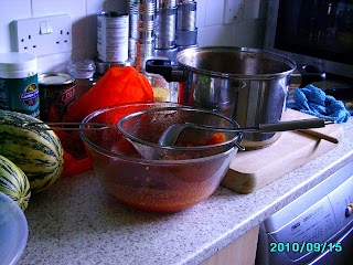 Another project in my kitchen last week had to do with tomatoes.  A couple we know who has an allotment gave us a large punnet of ripe tomatoes.  The very next day my husband’s best friend brought us a bag of tomatoes from his garden.  I knew that if I didn’t do something with this great haul of produce, most of them would be binned–which would have been shameful.  So I chopped up the two lots, put them in a large cooking pot and let them simmer for about an hour.  Then I sieved them, to get rid of the peel and the seeds.