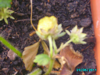 My little balcony garden is growing, albeit some warmth would truly help the garden.  We had our summer in April this year; it was so warm every window in the flat was open.  I even wore my summer pyjamas.  May was windy, as we experienced the leftovers from the tornados in the USA.  It’s been cool and showery since then.  However, I’m still excited in that the bean plants now have one purple blossom and the tomatoes are giving me lots of little yellow blossoms.  There are a couple of strawberries and the carrots and beet root seem to be flourishing.  I’m not sure of how much harvest to expect, as the buckets hold small amounts.  But since I love growing things, I’m glad to have them.  I’ve about decided that next year’s planting will be flowers—edible ones if I can find some.
