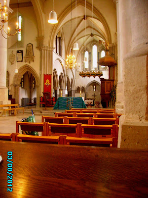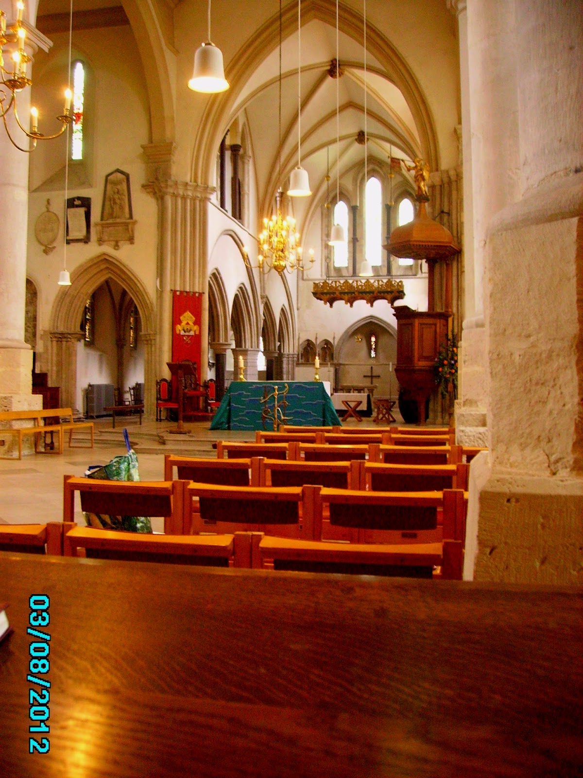 As we sat for a few minutes resting, the bride and groom—a royal naval officer in uniform—came back into the church for more photos. “Bea” surreptitiously snapped a photo of the couple. I stuck to taking photos of the chancel and stained glass windows. On the way out I took photos of the foyer. http://www.portsmouthcathedral.org.uk/