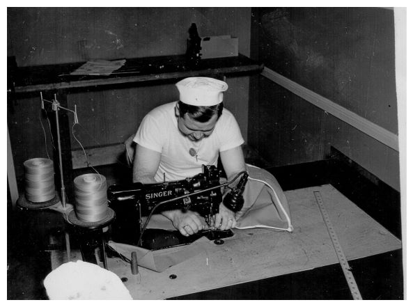 In both the Navy and the Air Force, my father was a parachute rigger. That required the use of sewing machines. In this photo, it looks like Dad is working on some sort of vinyl cover. Dad made lots of practical things with his sewing machine.