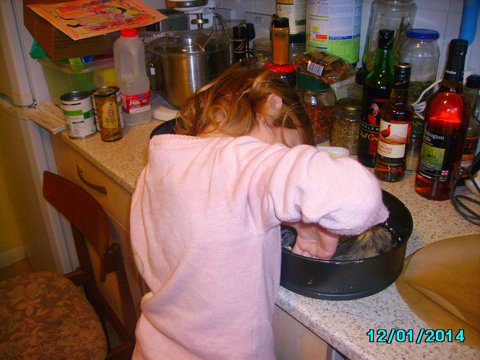 “Lolly! I left out the sugar!” We got the sugar out, measured out the right amount and divided it between the two cake tins.